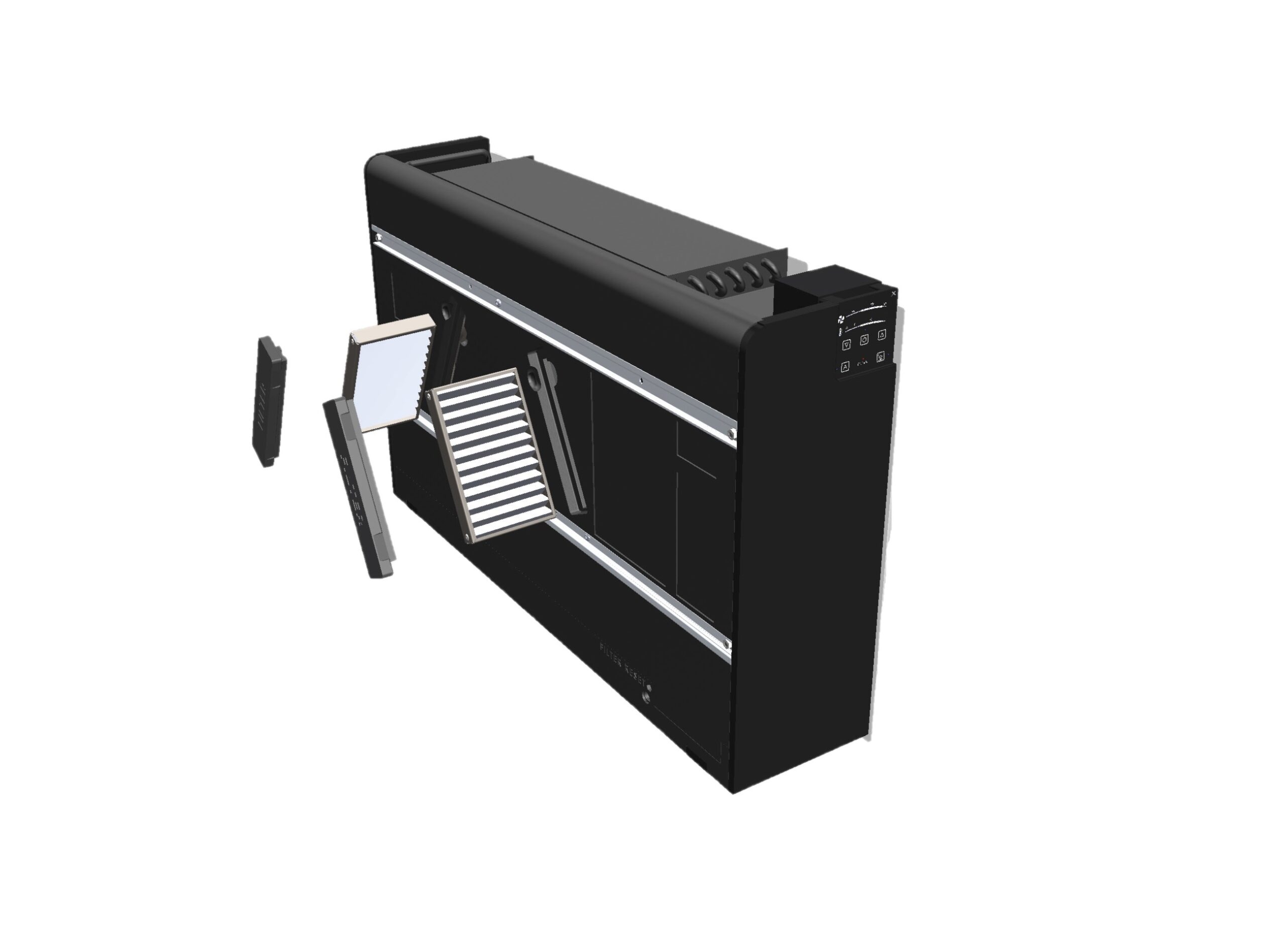 Dimensiunea este compacta, intraga structura este in EPP, rezultand o unitate de ventilatie cu greutate redusa. Panoul decorativ poate fi alb sau negru.